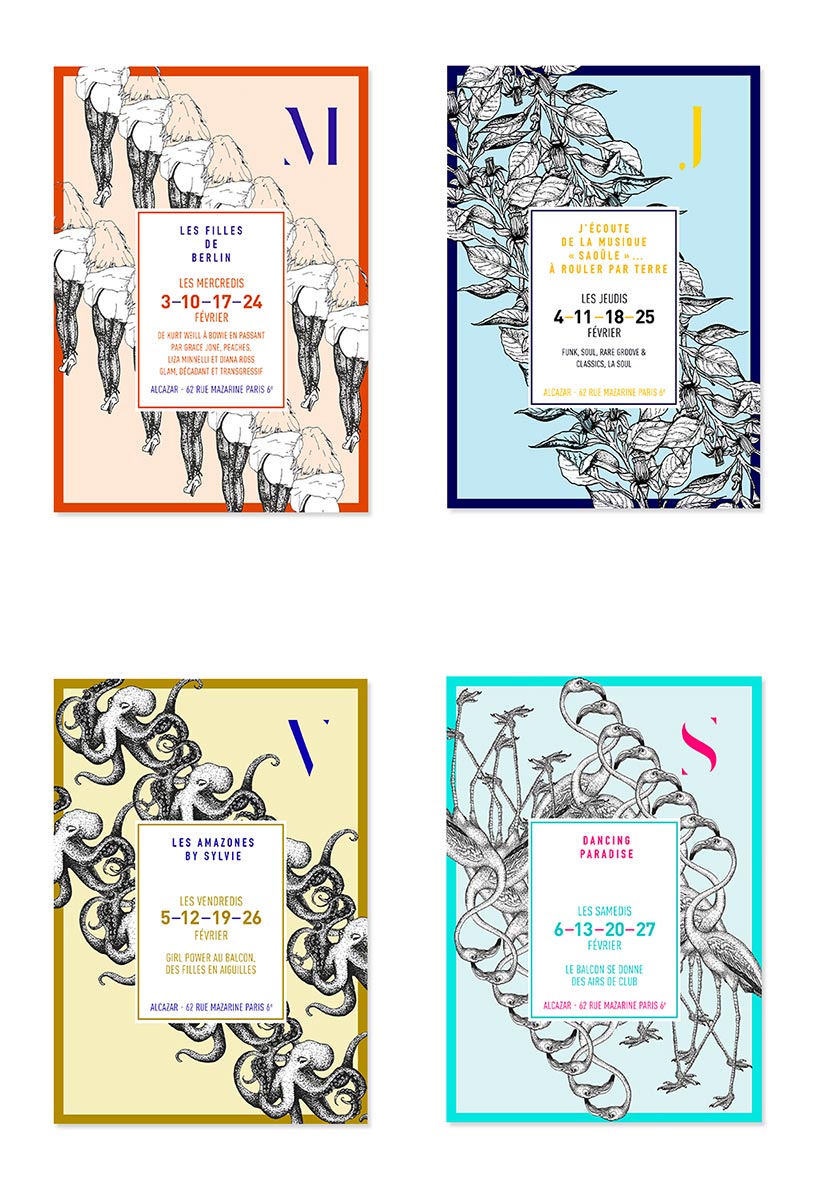 L’Alcazar Paris (Restaurant à Saint Germain des Prés) avait besoin d’une identité graphique pour quatre de ces soirées. Les quatre thèmes étaient imposés et j’avais pour mission de les illustrer : les filles de berlin / j’écoute de la musique “saoulé”... à rouler par terre / les amazones de sylvie / dancing paradise.
