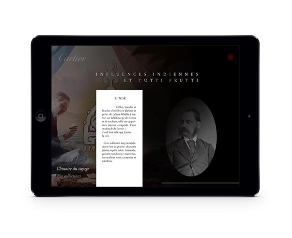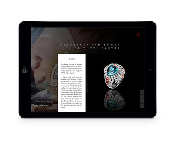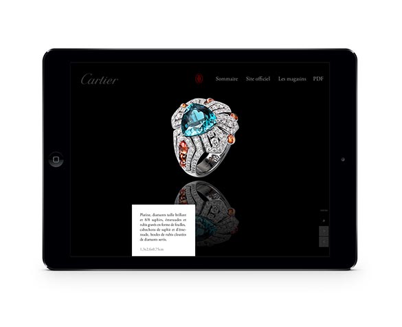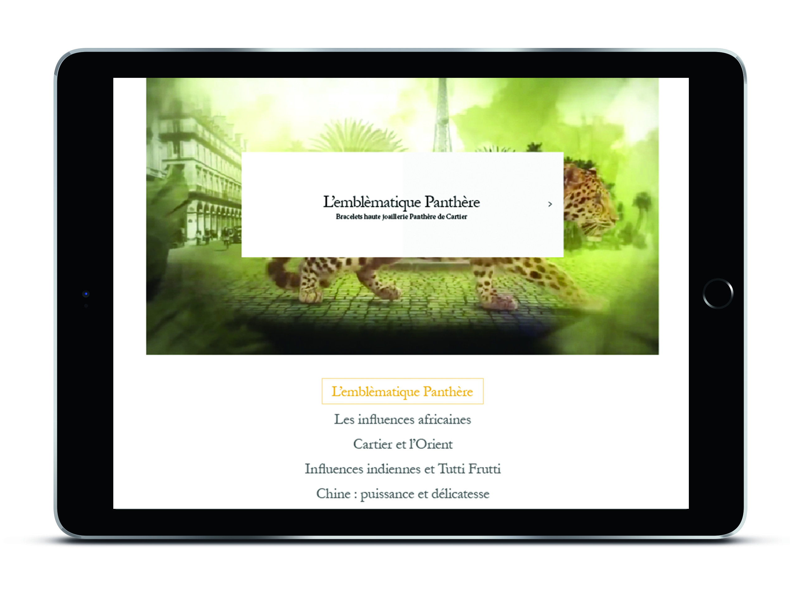 Pour le compte de la maison Cartier, nous avions pour commande de faire un pdf interactif sur format tablette pour présenter les collections récurrentes et les thèmes phares de la maison.